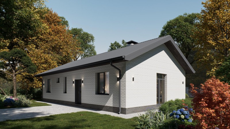 Одноэтажный дом с двускатной крышей, представляет собой классический вариант загородного дома. Двускатная крыша гармонично сочетается с окружающим ландшафтом, а деревянные вставки из лиственницы придают дому эстетичный вид.