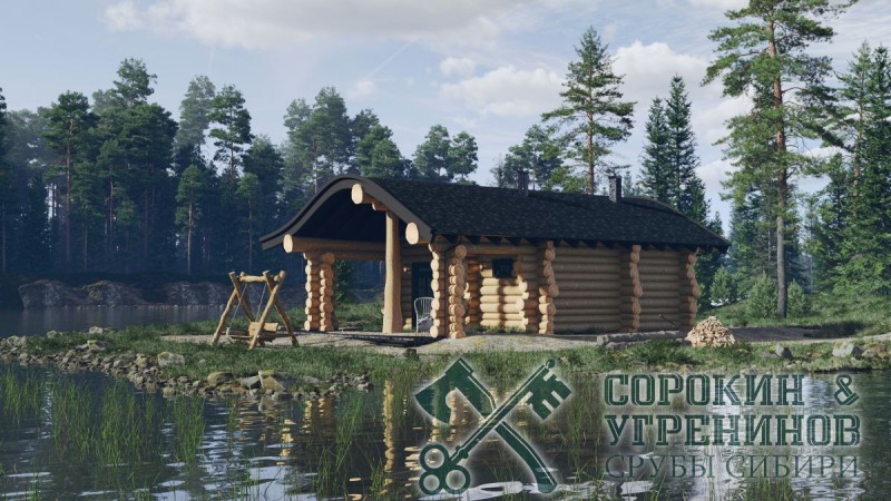 Сруб бани рубленый из бревна кедра диаметра 320мм, площадью 54,5м2 жилая и терраса 95м2. Размер сруба 8,6х11,6 метров по осям с учетом открытой террасы. Простая планировка бани, парная, душевая, комната отдыха, санузел, и большая терраса. Необычный вид создает стропильная система кровли из гнутых стропильных балок. Такая кровля будет дороже за счет гнутых клееных стропильных балок. Сруб рубленый вручную в русскую чашу (охлоп), брёвна окоренные гидро-окоркой (водой под высоким давлением), а так, же это можно сделать скобелем или лопатой, или строганное рубанком. Объем бревна в срубе 65м3.